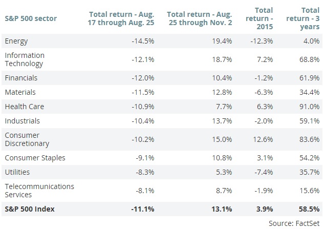 В ходе шести сессий подряд снижения с 17 по 25 августа энергетика и информационные технологии пострадали сильнее всего, тем не менее, именно эти секторы опередили все остальные с 25 августа, набрав даже больше потерянного в ходе летней турбулентности. Финансовый сектор так и не восстановил свои позиции. Относительная слабость акций финансового сектора в ходе восстановления, вероятно, отражает разочарование в том, что Федеральный комитет открытого рынка ФРС США решил подождать с повышением ставки по федеральным фондам, которая была зажата в диапазоне от 0 до 0.25% с конца 2008 года.