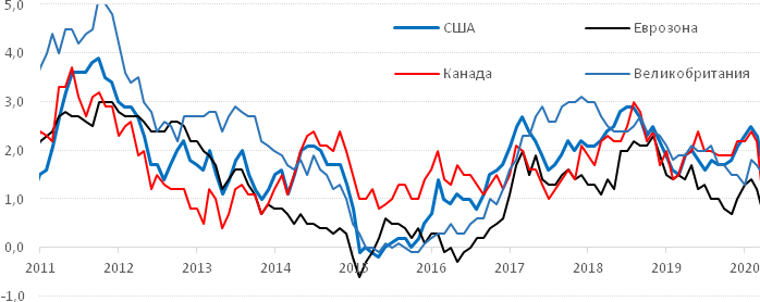 Принудительное охлаждение экономик по всему миру, вызванное мерами по борьбе с вирусом, привело к замедлению роста потребительских цен. Это очень хорошо видно по развитым странам, где рост потребительских цен в годовом выражении обнулился или даже стал отрицательным.