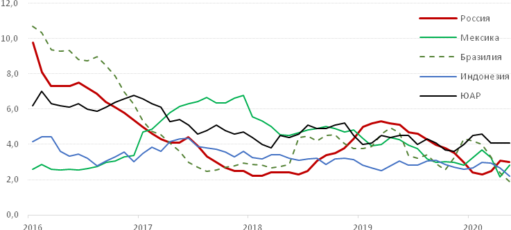 В развивающихся странах динамика инфляции менее однородна, но и там наблюдается общая тенденция к ее снижению. Это, кстати, говорит о правильности решения подавляющего большинства центральных банков развивающихся стран снизить ставки в ответ на всплеск волатильности на рынках на фоне распространения вируса.