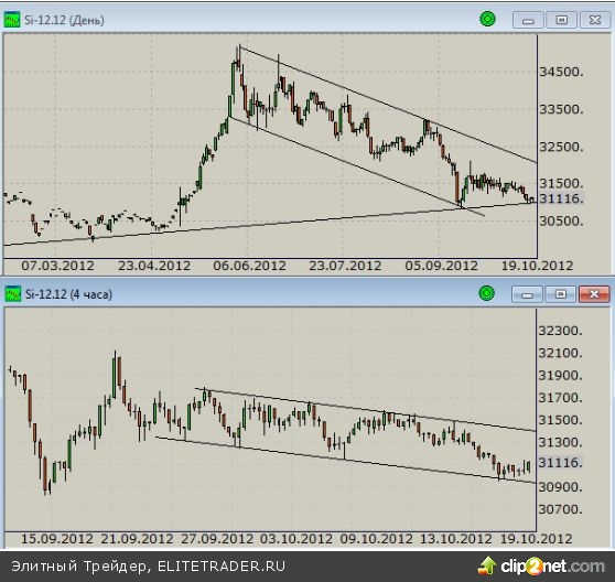 Фьючерс на пару доллар/рубль рассмотрим подробнее. Ниже представлены дневной и четырехчасовой графики котировок по состоянию на закрытие 18 октября.