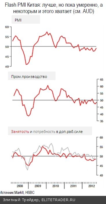 Кстати, в этом свете – о немецкой «неожиданности» (см. раздел новостей). В самом деле: как такое может быть, что ЕЦБ пообещал дать денег столько, сколько потребуется («сделать все») для спасения евро, саммит ЕС принял все необходимые решения… ну, без деталей, но принял же! А оптимизм немцев – на самом низком уровне с 2009 г. Как и PMI еврозоны. М.Драги даже переговорил с немецкими парламентариями и был.. частично понят (левыми, конечно), но по-прежнему не понят консерваторами. И все равно, все равно наступающая зима – а кто же иначе! – мешает сделать из немцев восторженных оптимистов… Как их южные соседи? Мы как-то, впрочем, говорили о том, что один Китай, даже если он перестанет тормозить (пока все равно рано говорить о новом выходе его экономики на крейсерскую скорость – см. графики выше) вряд ли сможет спасти Германию от влияния европейского кризиса, тяжелой рецессии у ее соседей и ближайших партнеров