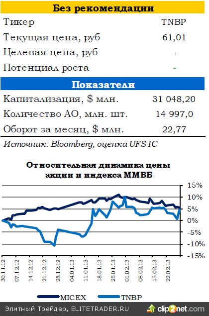 4К12 был достаточно слабым, и особого позитива в результатах мы не видим. В то же время «Роснефть» обещала позволить ТНК-ВР выплатить «прощальные» дивиденды. Прибыль по итогам года получилась неплохая, а свободный денежный поток и вовсе можно назвать сильным. В итоге выплаты традиционно могут быть неплохими, что на фоне значительно просевших бумаг обещает высокую дивидендную доходность. Мы ожидаем спекулятивных покупок в бумагах в надежде на высокие дивиденды.