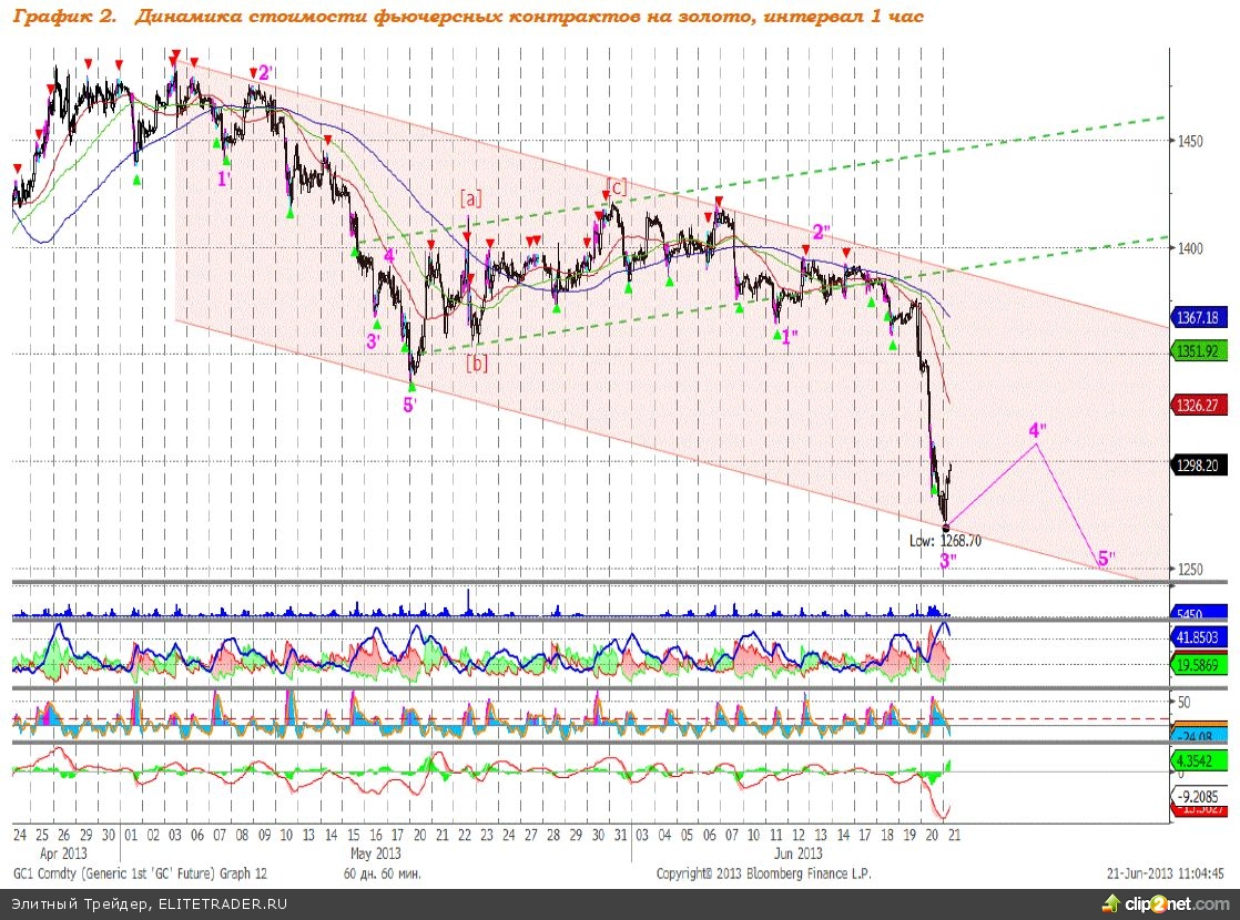 В настоящее время котировки золота, как видно из графика 2, находятся в рамках нисходящего канала, который обозначен красным цветом. Котировки золота завершили формирование волны 3” импульса, направленного вниз, достигнув нижней границы красного ценового коридора. В ближайшее время ожидаем развития восходящей волны 4”, целью которой видим уровень $1310 за тройскую унцию. Затем должна последовать завершающая волна 5” импульса (цель - $1250 за унцию), после чего ожидаем формирования среднесрочного восходящего тренда, ориентиром для которого выступает отметка $1600, см. график 2.