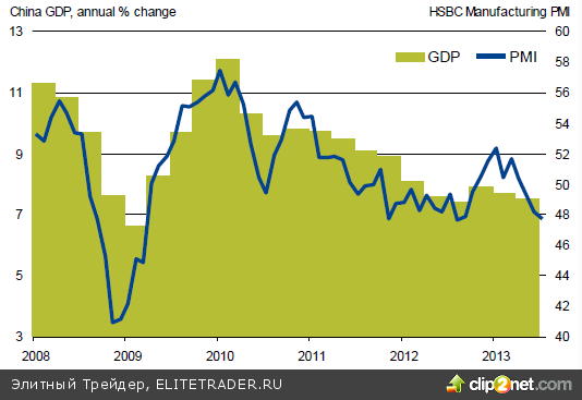 Главным драйвером падения котировок нефти стал Китай. После слабого ВВП за 2-й квартал очередное, четвертое по счету сокращение PMI в производственной сфере указывает на возможную реализацию пессимистичных прогнозов Societe Generale по ВВП за 2013 год в размере ниже 6%.