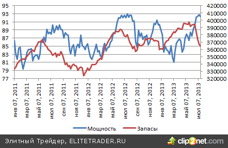 Рынок практически проигнорировал очередное сокращение запасов сырой нефти в США на 2,8 млн баррелей, предпочитая отыгрывать риск замедления экономического роста в Китае в связи с достижением китайским PMI в производственной сфере от HSBC 11-тимесячного минимума. Несмотря на то, что за четыре последних недели запасы сократились почти на 30 млн баррелей, их величина по прежнему выше принятого среднего для этого времени года. Виной тому служит рост объемов добычи, достигнувшей отметки 7,56 млн баррелей в сутки, максимальной за 22 года. Динамика сокращения запасов замедлилась, а сам показатель вышел в соответствии с прогнозами экспертов. Кроме того, НПЗ снизили мощность переработки с 92,8% до 92,3%, что позволяет прогнозировать дальнейшее уменьшение скорости снижения запасов.