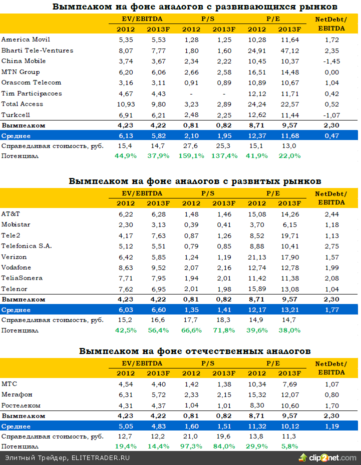 Сравнительный анализ показывает, что Вымпелком смотрится дешево относительно аналогов, как из развитых, так и из развивающихся стран. Более того, оператор торгуется значительно ниже по рыночным мультипликаторам и относительно отечественных конкурентов – МТС и Мегафона. Считаем, что в долгосрочной перспективе это отставание может снизиться.