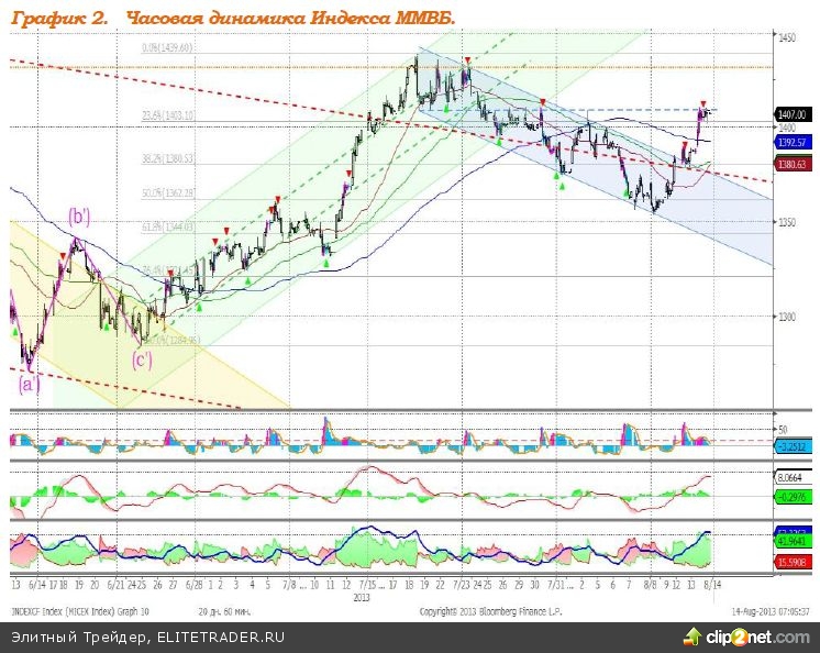 Индекс ММВБ – вышел из нисходящего канала, сопротивление на уровнях 1410 и 1440 пунктов. MACD выглядит нейтрально. DMI+ находится выше DMI-, ADX в верхней части шкалы и начал разворот вниз, что говорит о небольшом замедлении восходящего тренда. Индикатор, основанный на динамике ADX, 13 августа сформировал сигнал к снижению. Рекомендация: Покупать