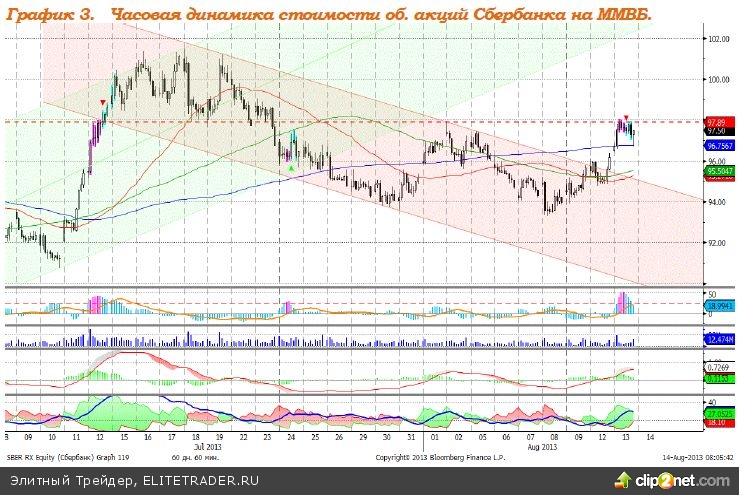Сбербанк – сформировал «двойное дно», после небольшой коррекции ожидаем роста к уровню 100,80 рубля. MACD сформировал сигнал вверх. ADX указывает на наличие восходящего тренда. Индикатор, основанный на динамике ADX, 13 августа дал сигнал к снижению. Поддержка: 96,00. Сопротивление: 101,00. Рекомендация: Покупать