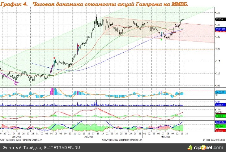 Газпром – вышел из коррекционного канала, при преодолении уровня 134,25 рубля возможно ускорение роста. MACD сформировал сигнал к росту. ADX указывает на начало развития восходящего локального тренда. Индикатор, основанный на динамике ADX, 7 августа сформировал сигнал к росту. Поддержка: 126,50. Сопротивление: 136,00. Рекомендация: Покупать