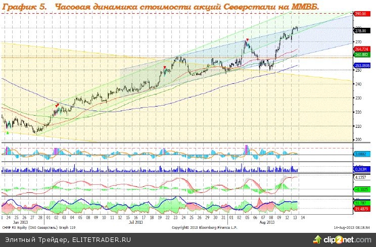 Северсталь – формирует восходящий тренд, возможна коррекция внутри восходящего канала. MACD выглядит нейтрально. ADX указывает на наличие восходящего локального тренда. Индикатор, основанный на динамике ADX, 5 августа дал сигнал к снижению. Поддержка: 264,00. Сопротивление: 282,0. Рекомендация: Держать.