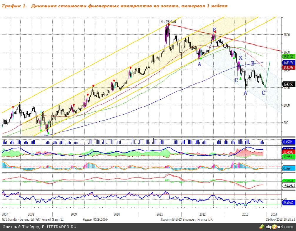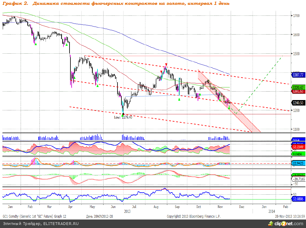 В течение неполного ноября 2013 года (на 28 ноября) котировки золота снизились на 6,04% до значения $1243,20 за тройскую унцию. Локально на рынке драгоценного металла продолжает развиваться движение вниз, которое может стать завершающей фазой снижения, чем можно воспользоваться для формирования длинных позиций в золоте. В ближайшие 1-1,5 месяца мы ожидаем снижения котировок металла к уровню $1175 за тройскую унцию, после чего, по нашему мнению, начнет формироваться долгосрочный восходящий тренд