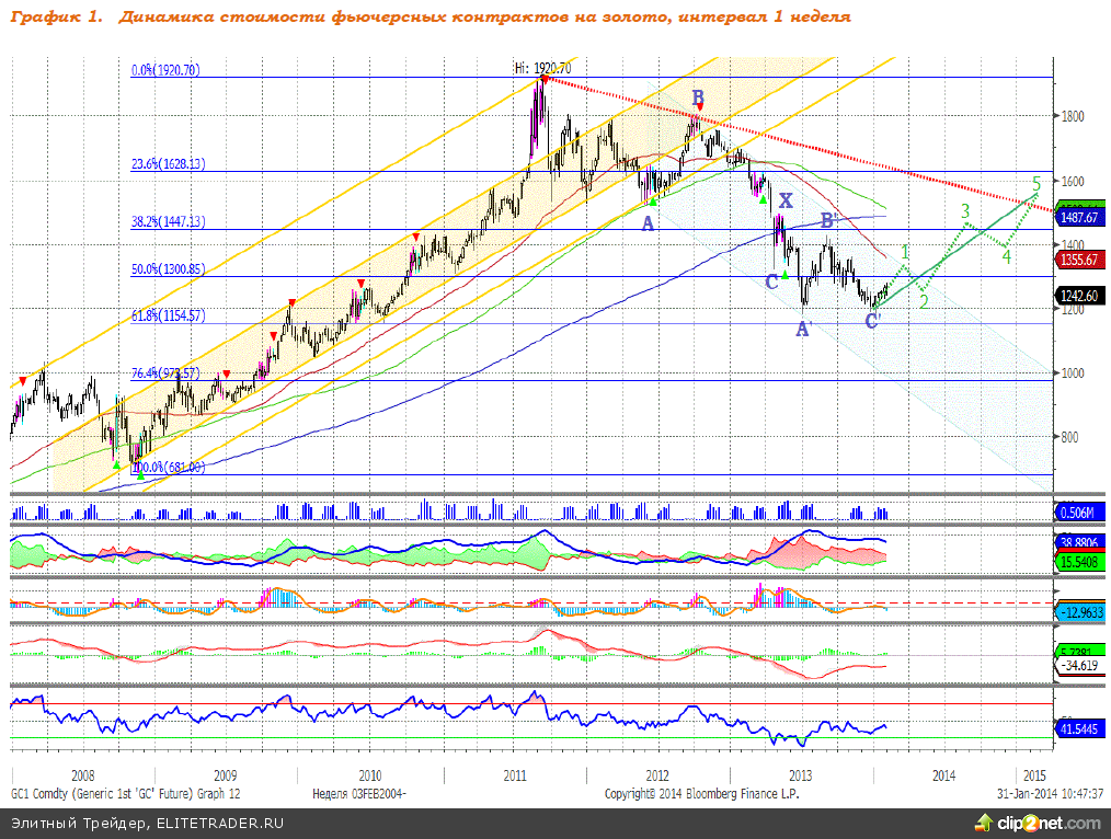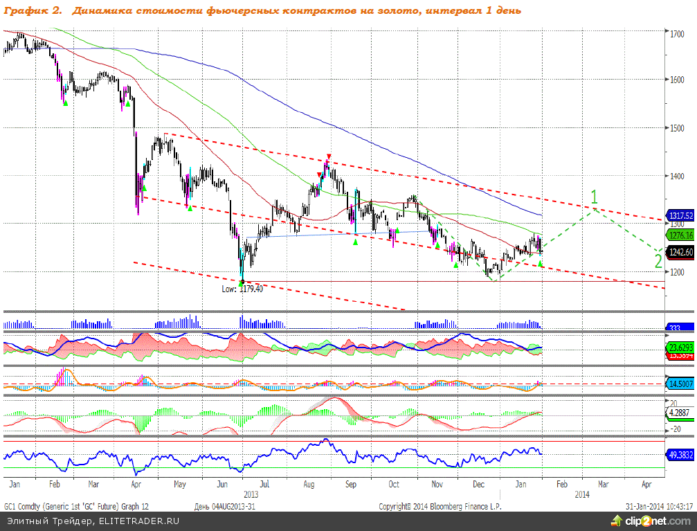Котировки золота в декабре 2013 года вошли в диапазон значений $1180-1200 за тройскую унцию, тем самым завершая волновую структуру снижения. В начале января 2014 года котировки резко двинулись вверх, обозначив стремление к росту. В ближайшей перспективе котировки драгоценного металла могут продолжить рост. На графиках 1 и 2 мы отобразили зеленой линией предполагаемую динамику стоимости контракта на золото. Полагаем, в скором времени цены на золото продолжат движение вверх, завершив формирование масштабной модели «двойное дно» (см. график 1), что станет сигналом к долгосрочному восходящему тренду