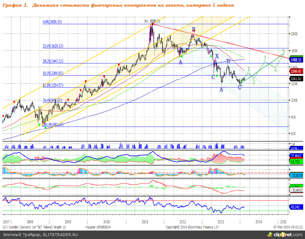 Котировки золота в декабре 2013 года вошли в диапазон значений $1180-1200 за тройскую унцию, тем самым завершая волновую структуру снижения. В начале января 2014 года котировки резко двинулись вверх, обозначив стремление к росту. В ближайшей перспективе стоимость драгоценного металла может продолжить возрастать. На графиках 1 и 2 мы отобразили зеленой линией предполагаемую динамику стоимости контракта на металл. Полагаем, в дальнейшем цены на золото продолжат движение вверх, завершив формирование масштабной модели «двойное дно» (см. график 1), что станет сигналом к долгосрочному восходящему тренду.