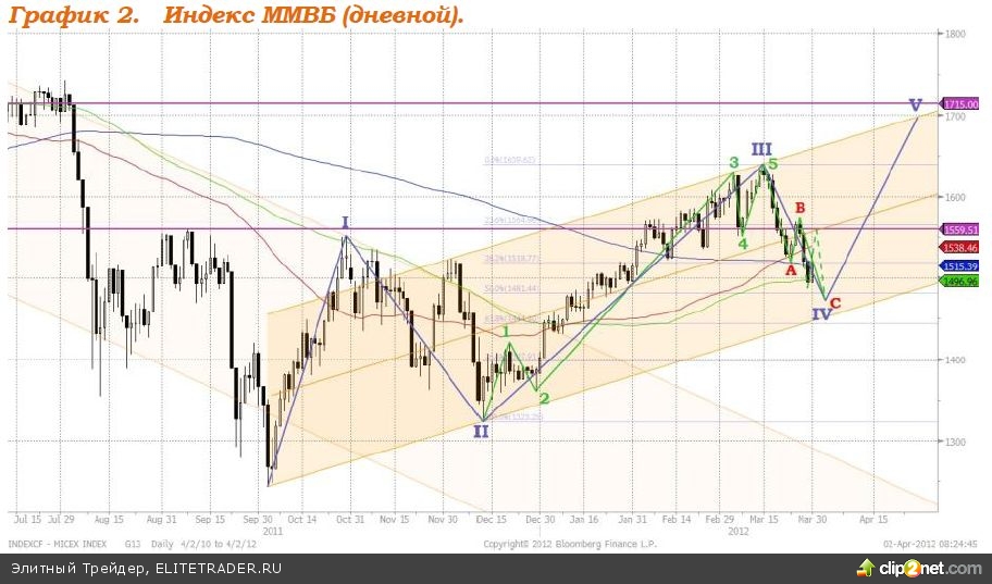 Индекс ММВБ в пятницу рос. Сегодня рост будет продолжен, целью роста служит уровень 1550 - 1560 пунктов. После отскока вверх движение индекса вниз возобновится - целью снижения служит уровень 1470 пунктов. В среднесрочной перспективе, после окончания коррекционного движения вниз, ожидаем возобновление роста котировок российских акций, ориентиром новой фазы роста служит уровень 1700 пунктов (см график 2).