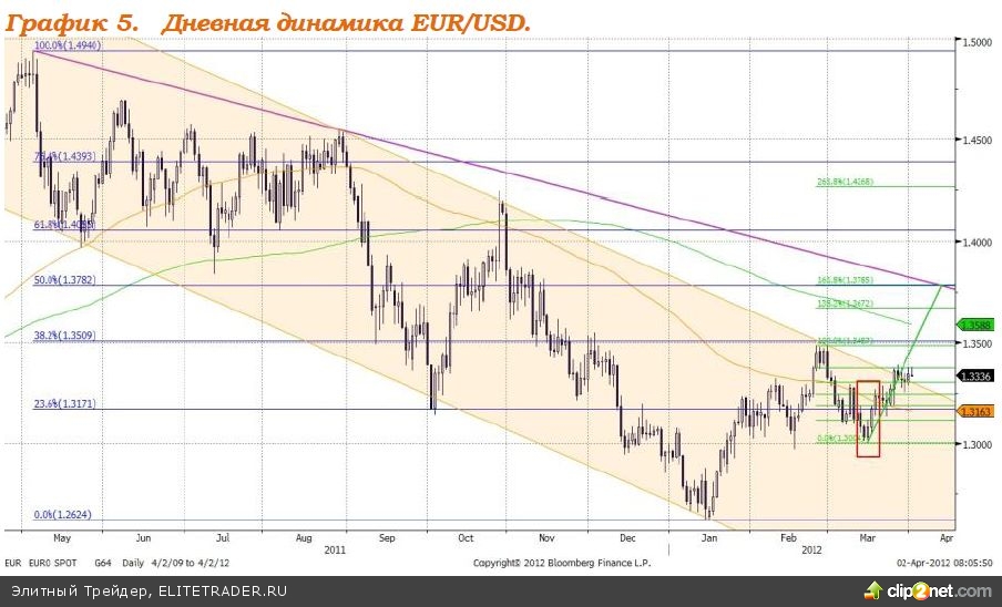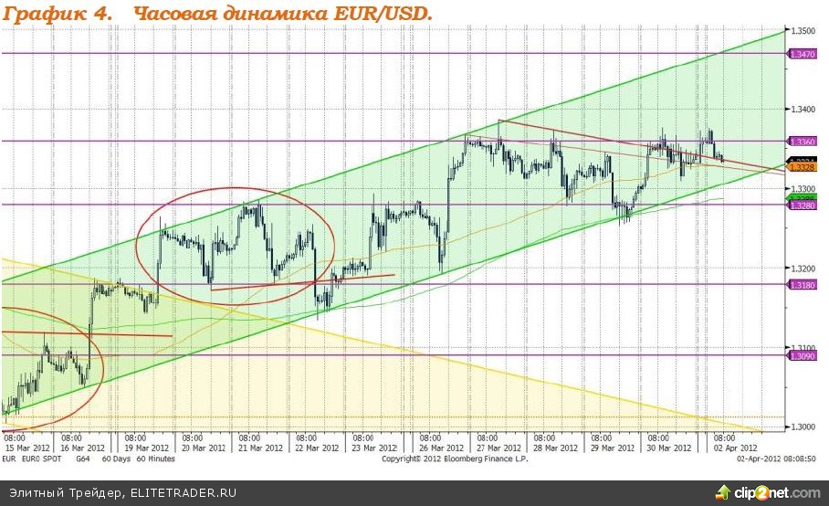 Валютная пара евро/доллар, продолжает восходящее движение в рамках зелёного канала (см график 4). В пятницу пара тестировала в качестве поддержки линию, которая образовалась внутри канала, обозначена на графике тёмно-красным цветом. По сути, сформировалась консолидация, которая должна разрешиться ростом. Ориентир роста - верхняя граница зелёного канала, уровень 1,3470 - 1,3480.