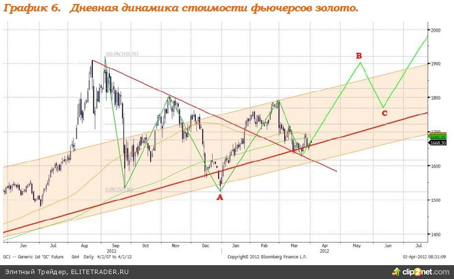 Золото в среднесрочной перспективе достигло сильного уровня поддержки, который изображен на графике 6 красной линией. На графике драгоценного металла формируется масштабная плоская коррекция, приблизительная схема которой изображена на графике 6. Полагаем, ближайшие недели нас ждет рост котировок золота к уровню $1900 за тройскую унцию