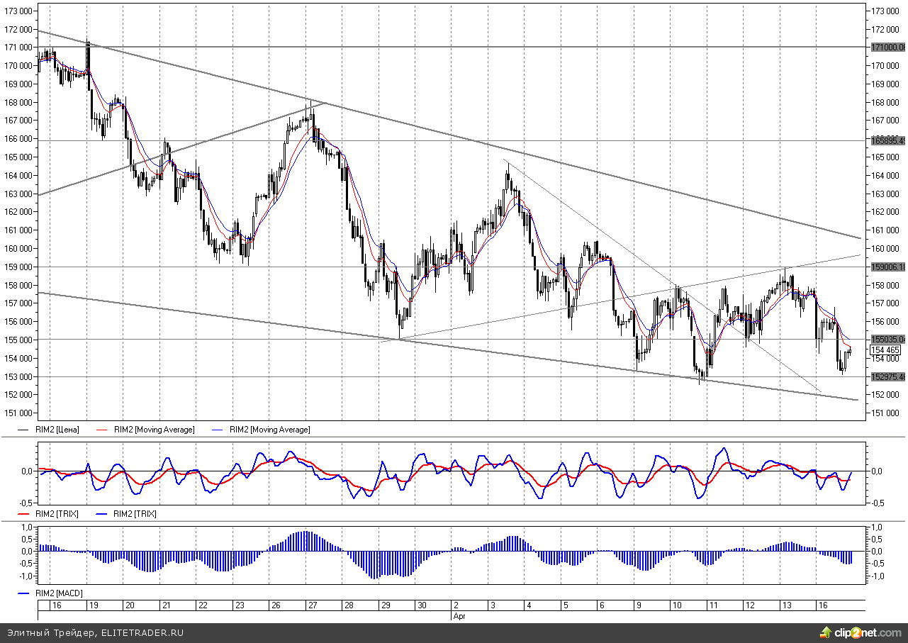 В целом, RIM2 по-прежнему находится в рамках широкого полуторамесячного нисходящего клина с границами на 152000 и 160500. Подобные формации обычно по технике реализуются выходом вверх.