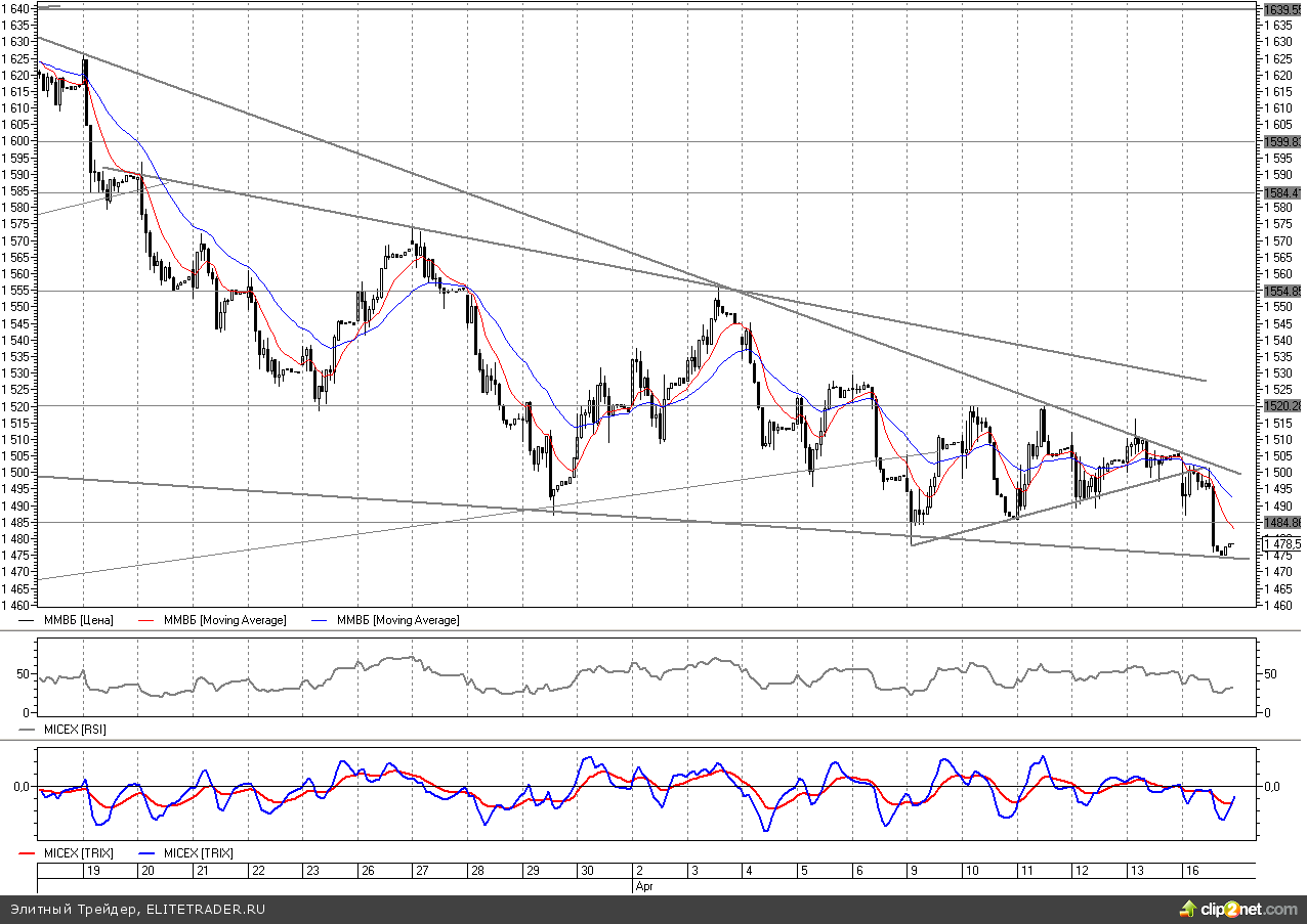 Российский рынок сегодня будет пробовать отыграть часть потерь, понесенных накануне. Но по инерции может пройти еще одна волна вниз, даже с обновлением апрельских минимумов. Но индекс ММВБ сейчас находится поблизости к линии поддержки на 1470, которая одновременно является и нижней границей нисходящего клина. Некоторые голубые фишки также находятся вблизи своих сильных поддержек. Ближайшие сопротивления для ММВБ на 1485 и 1500