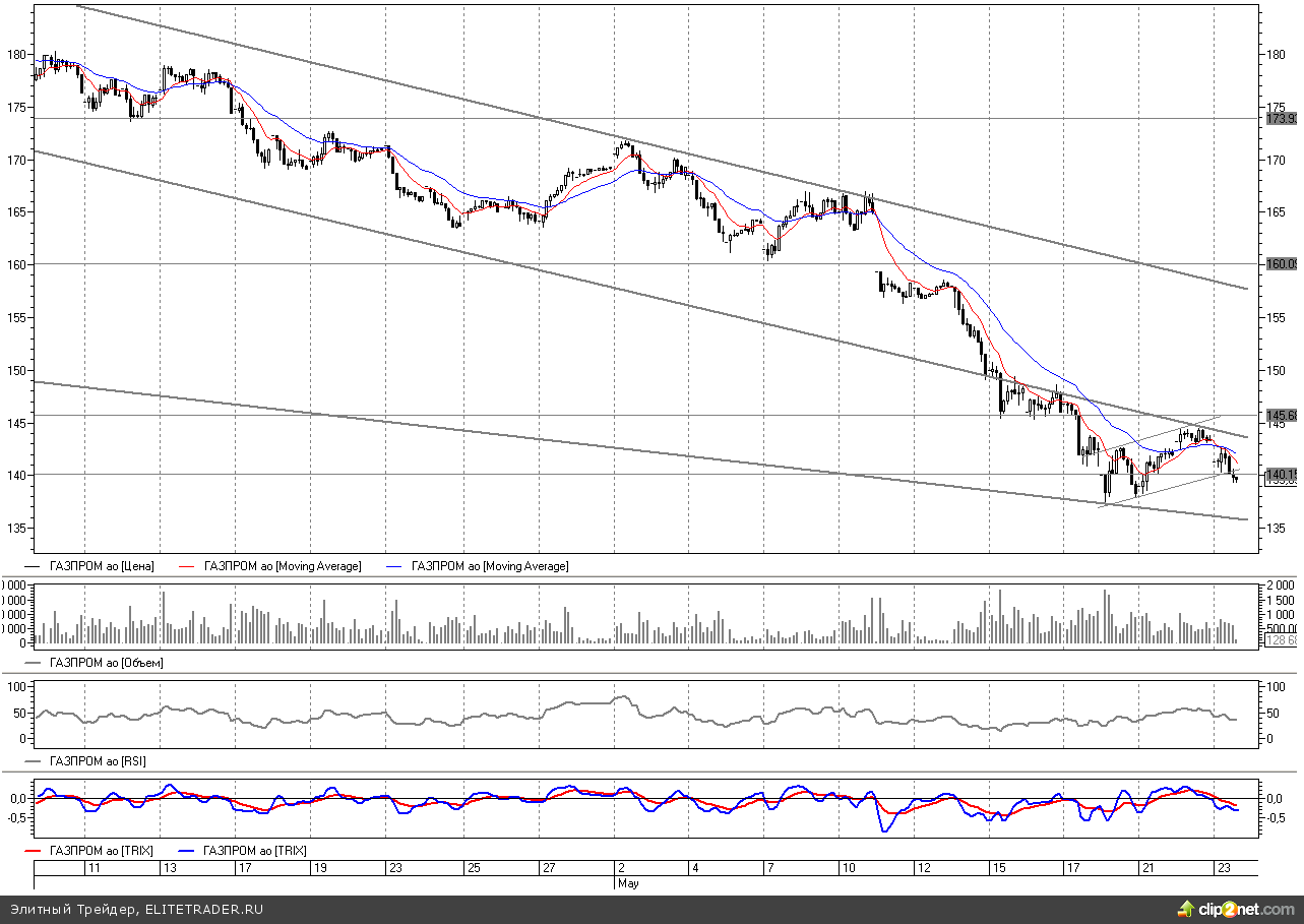 Радость на улице быков была недолгой. Доотскакивались «флагом», как говорится. Технический отскок с текущих минимумов сменился новой волной падения. Цена вернулась к отметке в 140 рублей. Хотя на этот раз Газпром хоть немного, но смотрится «лучше рынка».