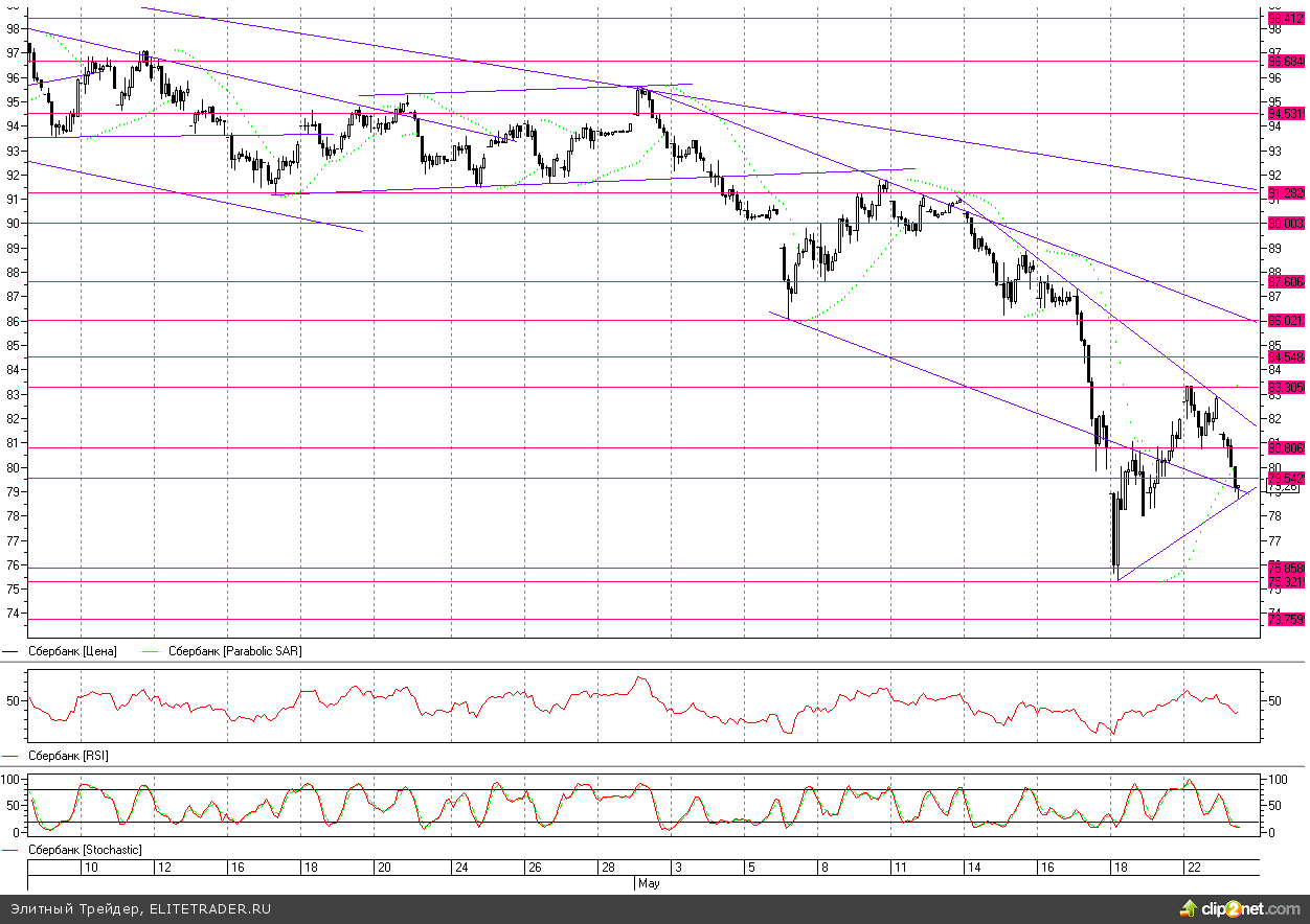 В общем и целом мировая конъюнктура едва ли способствует скорейшему возвращению инвесторов в рисковые активы на фоне потенциального выхода Греции и зоны евро и ожидаемого навеса регулятивного давления на финансовых рынках в США в связи с последним триггером к ужесточению контроля за Wall Street - убытками JP Morgan. Тем не менее, короткие стопы никто не отменял, а краткосрочно текущая часовая свеча может сформироваться как разворотная, в случае чего можно принять сторону быков с целью возвращения к 80,8.