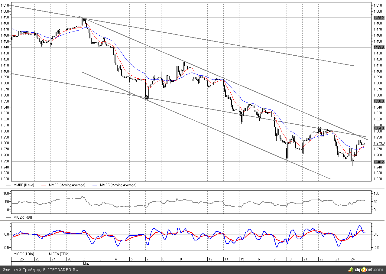 Однако в течение дня будут предприниматься попытки развить вчерашний успех. В то же время индекс ММВБ сейчас вблизи сопротивления своего месячного нисходящего канала на 1285. Если его удастся пройти и продолжить подъем до 1305 на графике ММВБ будет сформирована разворотная фигура «двойного дна».