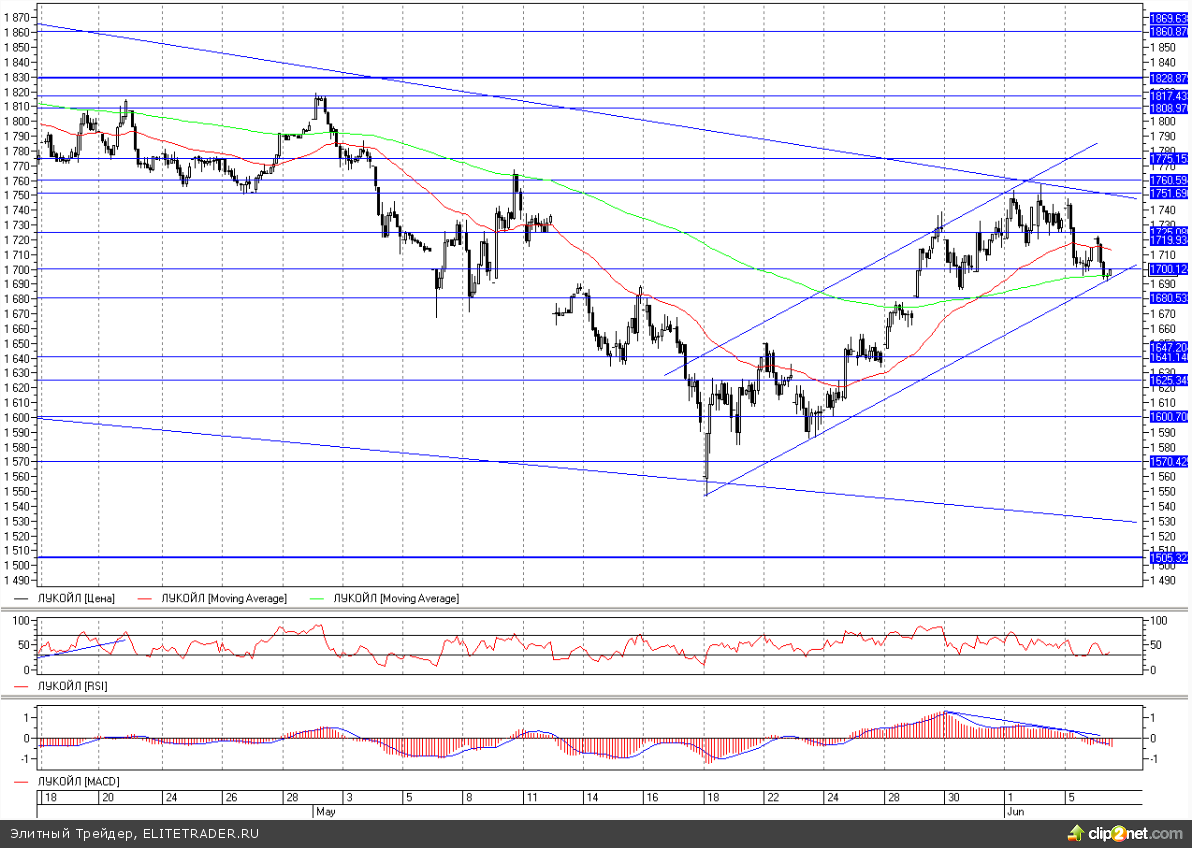 По предыдущей торговой рекомендации у нас была возможность открыть лонг из диапазона 1700 - 1725, и в этом случае позиция должна быть до сих пор открыта, поскольку после очередного достижения уровня 1740 бумага вновь начала откатываться вниз. Сейчас движение проходит около нижней границы краткосрочного восходящего канала в районе уровня 1700, угрожая перспективам покупателей. Стоп стоит ниже уровня 1680, и в случае пробоя этой отметки мы переворачиваемся в шорт с потенциалом движения на 1600.