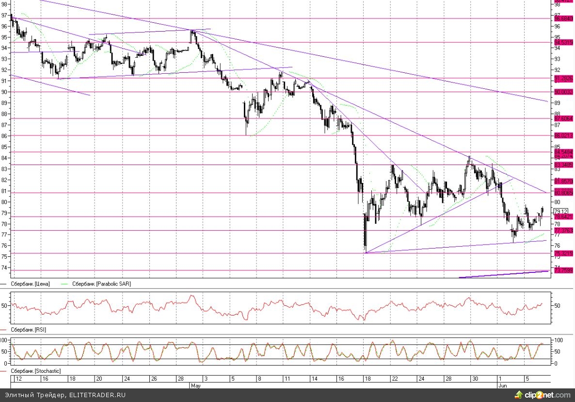 Не смотря на неудачное начало очередной торговой недели, котировки акций Сбербанка удержались от возвращения к майским минимумам. На данный момент цена консолидируется недалеко от месячного down-тренда, который станет целью быков в ближайшие часы в случае позитивных новостей со стороны ЕЦБ по поддержке экономики и финансового сектора в частности. На более далеком горизонте пока улучшений не ожидается, здесь зреет снижение в район 70 руб, судя по месячным графикам. Тем не менее, в краткосрочной перспективе дотянуть до 80,8 быкам вполне по силам, с учетом того, что завтра будет обнародована отчетность банка по РСБУ за май 2012 года. Таким образом, можно сыграть в лонг от уровня 78,6 с целью на 80,8, но, нужно сказать, велик риск нарваться на стопы, ввиду ожидающегося повышения волатильности на фоне решения ЕЦБ и комментариев Марио Драги, поэтому стоит либо входить малым объемом, а стоп располагать чуть ниже локальной поддержки на 77,4, либо ждать отката для покупки от 77,4.