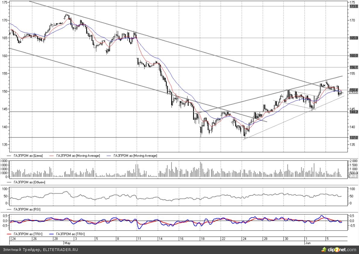 Начавшийся в конце мая отскок продолжается и в июне, вот только идет с большим трудом. Газпром уже две недели с майских минимумов корректируется восходящим клином. Последние дни торговля идет около отметки в 150 рублей. Сегодня цена немного откатилась назад к линии поддержки двухнедельного восходящего канала с конца мая.