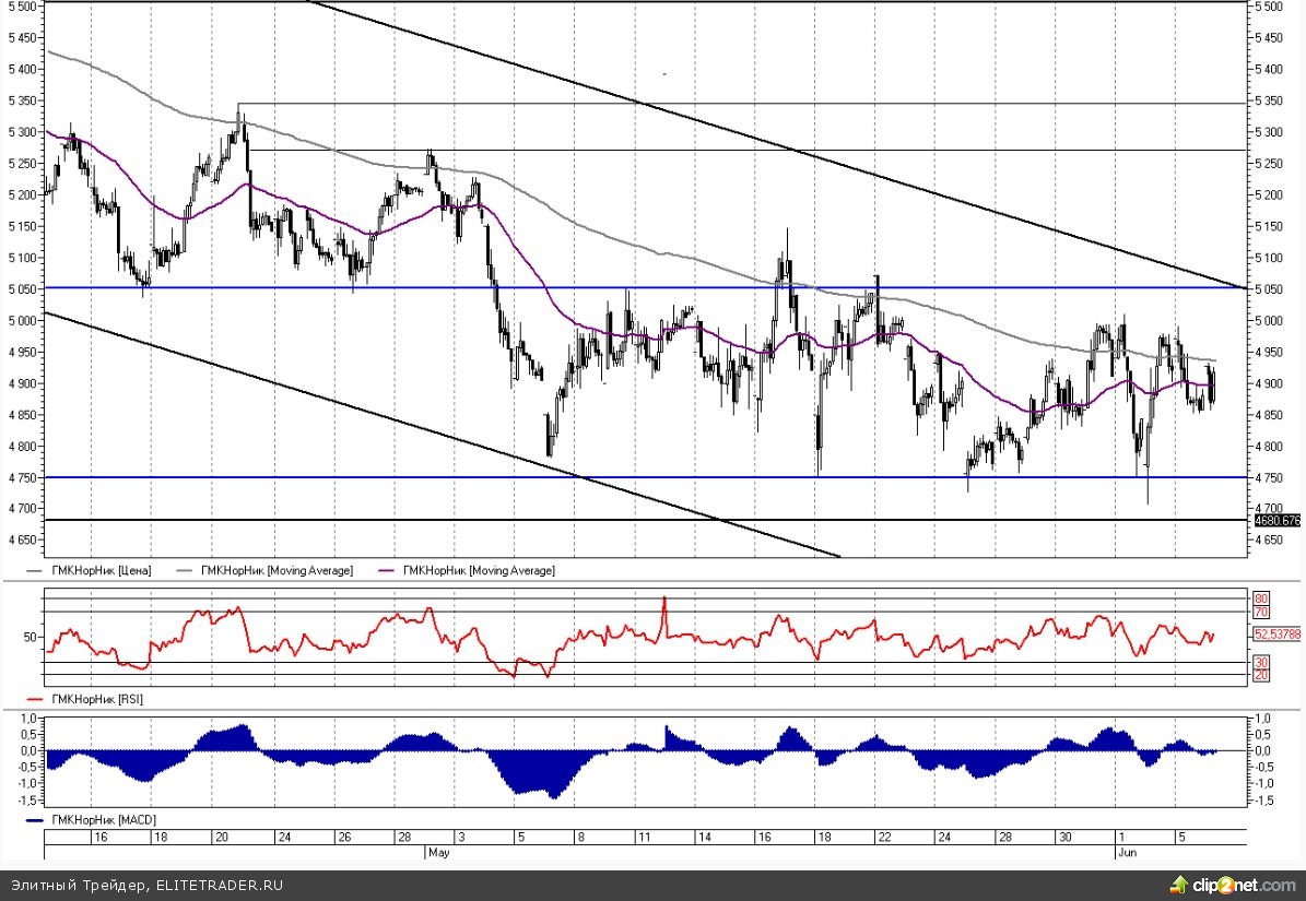 На данный момент мы наблюдаем за тем, как цены колеблются в рамках широкого бокового коридора. Его нижняя граница расположена в зоне торможения 4700-4750 руб. Эта область до сих пор являлась той опорой, ниже которой бумаги не смогли пройти даже в моменты максимального пессимизма на рынке. Скорее всего, при сохранении стабильного внешнего фона, переписать эти минимумы в июне уже не удастся.