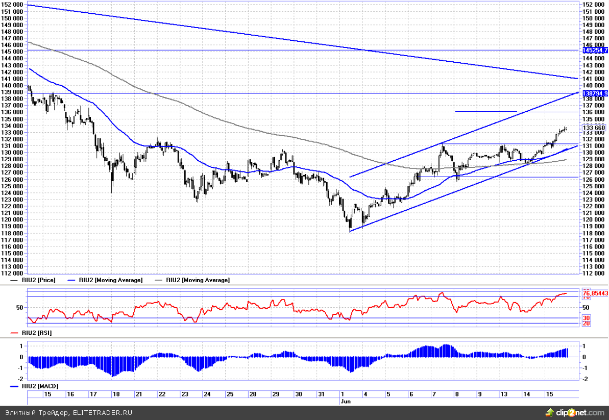 После этого в течение дня пройдет откат назад. Ближайшая поддержка - нижняя граница двухнедельного восходящего тренда с июньских минимумов на 131000-132000. Там же находится пробитый накануне уровень с середины мая. Но на этой неделе подъем имеет все шансы продолжиться, что может позволить фьючерсу на РТС подняться в перспективе даже до 140000.