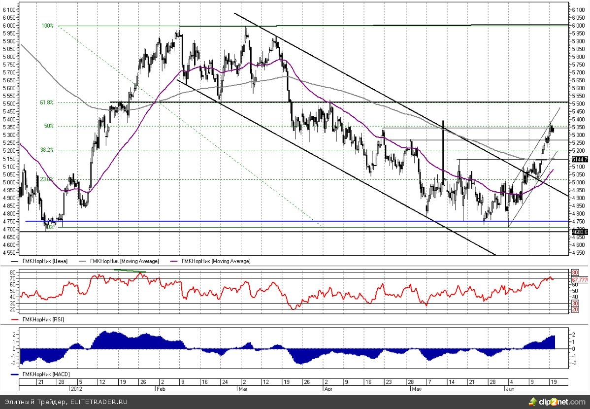 В данный момент бумаги Норникеля торгуются около уровня 5335 руб., прибавляя 0,25%. В прошлой рекомендации мы советовали продолжать удерживать длинные позиции в акциях ГМК, так как признаков разворота и формирования очередного локального down-тренда обнаружено не было. Медленно, но верно котировки пришли к своей первой среднесрочной цели на 5250 руб. Около этого рубежа рекомендовалось начинать фиксировать спекулятивные длинные позиции. Также отмечалось, что потенциал восходящего движения предполагал рост вплоть до 5350 руб. - эту отметку удалось покорить вчера.