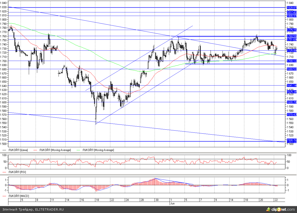 По предыдущей торговой рекомендации мы закрыли часть имеющегося лонга у верхней границы текущего бокового диапазона, при формировании отскока от нее, вторая же часть позиции была закрыта сегодня утром по стопу. Пятницу бумага проводит между 50-ти и 200 - часовой скользящими средними, при этом тестирование первой началось еще в первых числах месяца. Однако, не смотря на все попытки, медведи так и не сумели ни разу продавить ее вниз. Тем не менее, наличие дополнительных уровней поддержки и сопротивления не лишает актуальности границы текущего бокового диапазона 1690 - 1760, от направления выхода из которого и будет зависеть дальнейшая динамика. С первых чисел текущего месяца бумага ушла в узкий боковик, недавно его удалось несколько расширить, однако картины это не меняет. Таким образом, торговый план от недели к неделе у нас подвергается лишь незначительным изменениям.