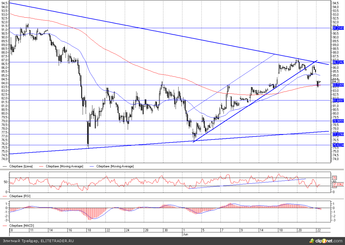 По предыдущей торговой рекомендации мы открыли шорт в четверг на открытии торгов, которое произошло ниже обозначенного уровня 85,5. Практически весь день после этого бумага демонстрировала положительную динамику, однако, немного не дойдя до нашего стопа, вновь развернулась вниз. Благодаря негативному внешнему фону обозначенная цель краткосрочного снижения была достигнута на открытии сегодня, так что шорт мы закрыли с профитом. Сегодня бумага тестирует поддержку на 83,7, где также проходит линия 200 - часовой скользящей средней. От итогов этого тестирования зависит динамика на ближайшую перспективу, и не только. Если медведям удастся продавить ее вниз, то целью снижения станет линия среднесрочного восходящего тренда, проходящая в районе 78. В противном же случае начнется формирование «бычьего флага», выход из которого с большей вероятностью произойдет вверх. Ключевым сопротивлением, при этом, по-прежнему выступает уровень 86,7.