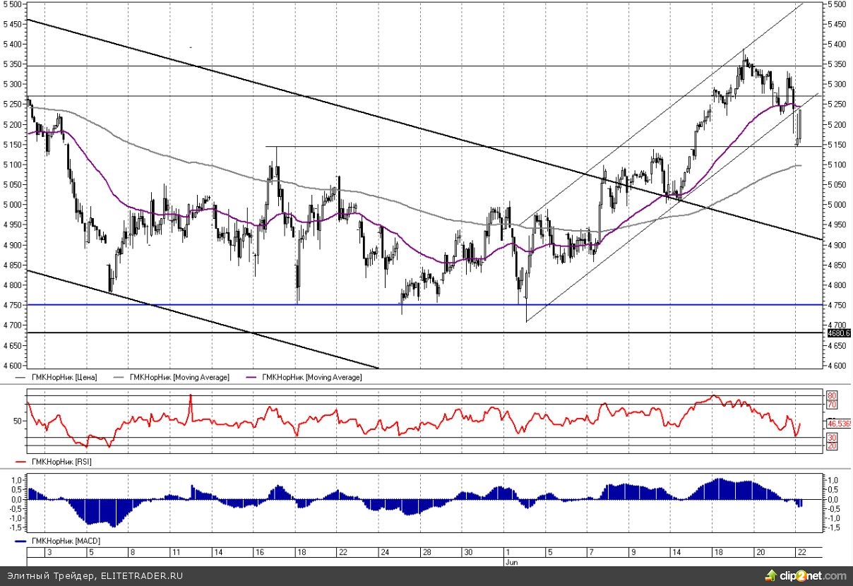 В данный момент бумаги Норникеля торгуются около уровня 5235 руб., теряя 0,11%. В прошлой рекомендации мы советовали закрывать длинные позиции и присмотреться к среднесрочному шорту. К сожалению, до уровней безопасной продажи (5450 руб.) котировки так и не дошли.
