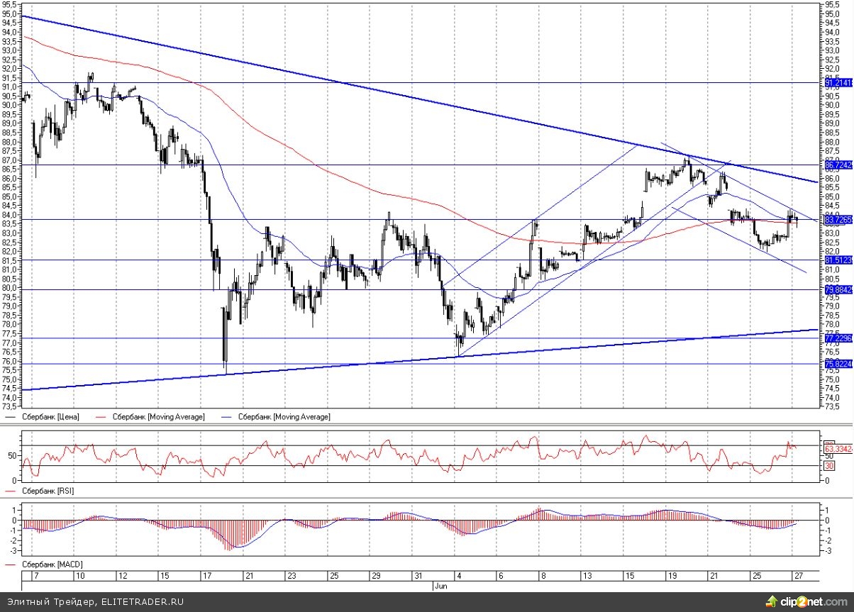 По последней торговой рекомендации мы открыли среднесрочный шорт при пробое уровня 83,7, однако техническая картина в бумаге с того момента несколько изменилась. Сформировав локальный минимум в районе уровня 82, бумага развернулась наверх и в данный момент тестирует пробитую ранее отметку 83,7. Образовавшийся при этом «бычий флаг» уравновесил чашу весов в пользу покупателей, и его разрешение может привести к возобновлению волны роста с начала июня. Таким образом, перспективы нисходящей динамики сейчас уже не столь безоблачны, как ранее, и логичным будет закрыть часть открытого шорта, пока есть возможность, в безубытке, дабы снизить имеющиеся риски. Оставшуюся же часть позиции мы оставим неизменной. Если же держать среднесрочную позицию сейчас не приходится, то можно попробовать краткосрочно сыграть то лонга, в случае выхода вверх из имеющегося флага, с целью на линии среднесрочного нисходящего тренда.