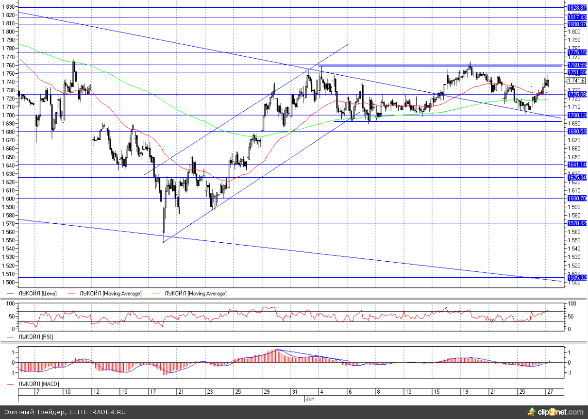 Акции Лукойла упорно не хотят выходить из образовавшегося месяц назад четырехпроцентного боковика, и фактически продолжают игнорировать движения отечественного рынка. Кто-то скажет, что в бумаге воцарилась «стабильность», но мне кажется, что это «застой». Так что с момента выхода последней торговой рекомендации техническая картина в бумаге абсолютно не изменилась, и для открытия новых позиций необходимо дождаться выхода из диапазона 1690 - 1760. При этом не стоит исключать возможность формирования ложных пробоев, поскольку столь длительное движение в боковике может привести к неожиданному разрешению, казалось бы, очевидной ситуации. Таким образом, торговый план остается практически неизменным уже на протяжении нескольких недель.