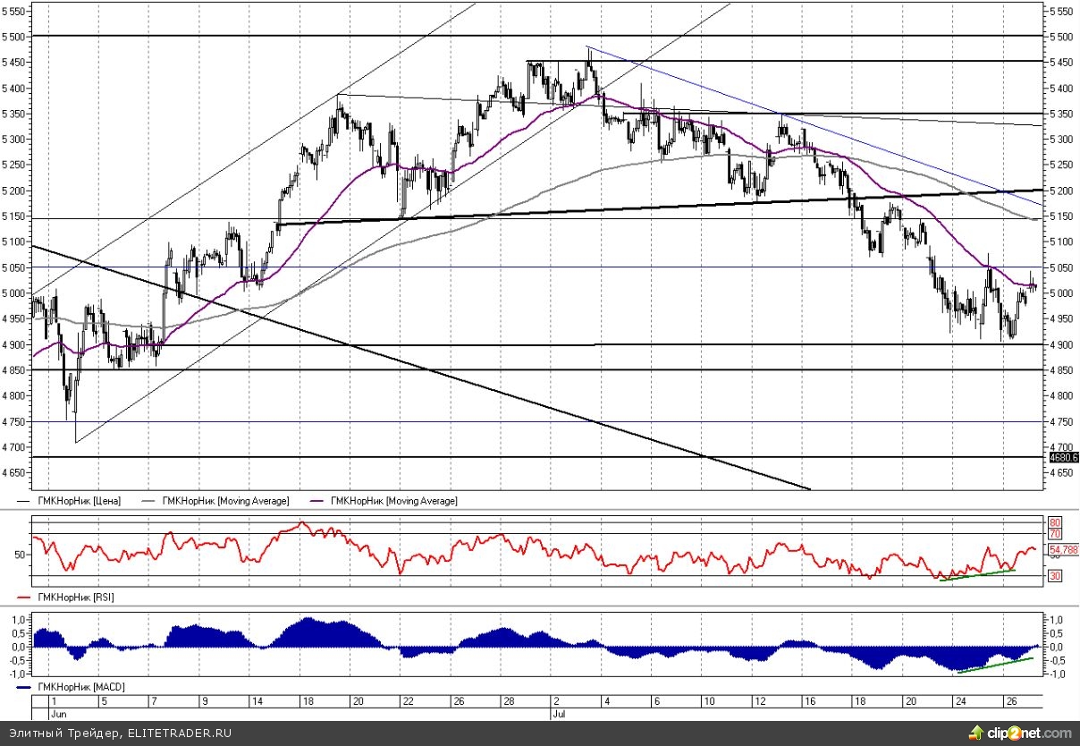 В данный момент бумаги Норникеля торгуются около уровня 5015 руб., теряя 0,70%. В прошлой рекомендации мы советовали закрывать короткие позиции, так как целевой уровень шорта на 4910 руб. был достигнут.