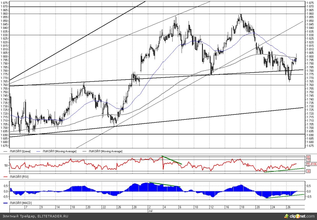 Общий среднесрочный негативный взгляд по бумагам по-прежнему остается в силе. В самое ближайшее время мы еще можем увидеть попытки восстановления и возврат за 1800 на фоне отработки образовавшихся на часовиках бычьих дивергенций, однако наша цель снижения на уровне 1730 все также является актуальной. Об отмене негативного сценария можно будет говорить лишь в случае возврата котировок Лукойла выше уровня 1830 руб. До этого момента медведи могут быть спокойны. Таким образом, рекомендация по удержанию коротких позиций согласно прежним параметрам сохраняется.