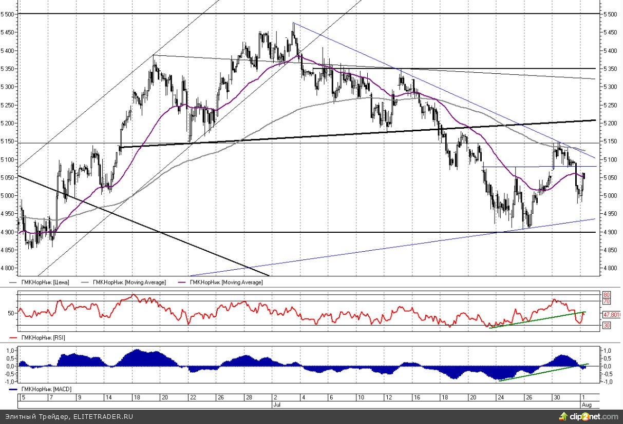 В данный момент бумаги Норникеля торгуются около уровня 5060 руб., прибавляя 1,15%. В прошлой рекомендации в пятницу мы советовали ждать своего шанса, работая от важных уровней поддержки и сопротивления. К сожалению, за это время акции ГМК так и не посетили рубежи, от которых можно было открывать позиции.