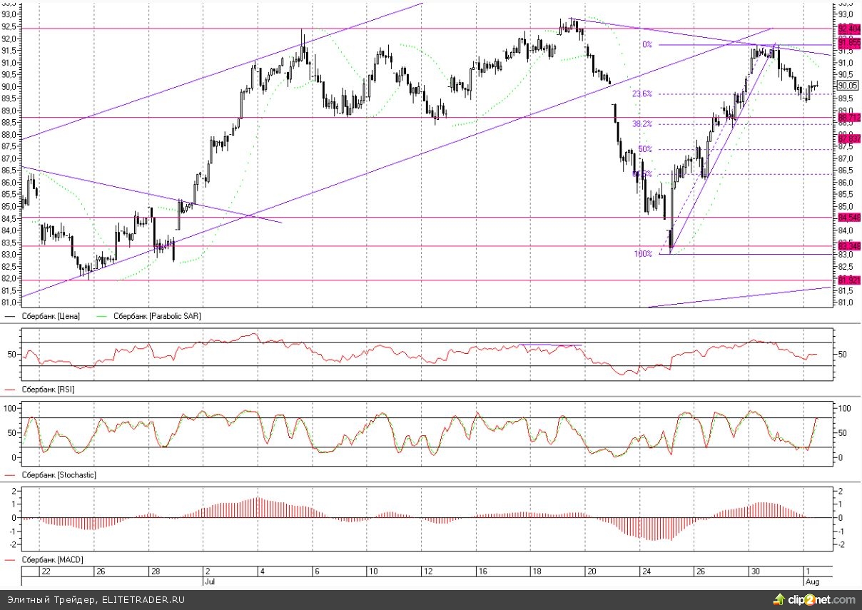 Цена на акции Сбербанка в первой половине текущей недели не смогла дотянуться до июльских максимумов, откатившись к первому коррекционному уровню по Фибоначчи после пробоя крутого восходящего микротренда. На данный момент котировки демонстрируют небольшой отскок, однако техническая картина складывается в пользу возобновления снижения. В частности в рамках дневного графика наблюдается разворотная модель на пике - медвежье поглощение. Кривые стохастического осциллятора пересекаются в зоне перекупленности, указывая направление вниз. На часовом графике негативные сигналы наблюдаются по трендовому индикатору Parabolic, тогда как по осцилляторам сохраняется нейтралитет.
