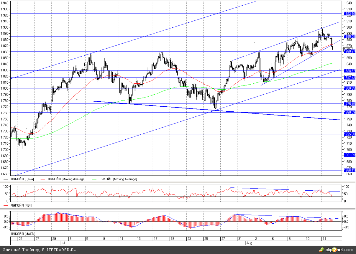 С момента выхода последней торговой рекомендации позиция акций Лукойла практически не изменилась, разве что быками была предпринята безуспешная попытка закрепиться выше уровня 1885. К текущему моменту бумага практически вернулась к уровню закрытия пятницы, так что можно сказать, что прошедшие чуть более двух торговых сессий бумага провела в боковике. Если в прошлую пятницу на часовом графике мы не имели четкой картины настроения рынка, то сейчас такая картина уже приобретает довольно конкретные очертания, причем медвежьего свойства. В качестве негативных факторов можно отметить дивергенцию с MACD, которая приобрела новую, причем более уверенную, форму, а также неудачную попытку пробоя уровня сопротивления, сопровождаемую обновлением локальных максимумов и последующим откатом вниз. Тем временем дневной график также продолжает излучать негатив, при этом медвежья дивергенция с техническими индикаторами, формируемая на нем еще с начала месяца, сейчас поддерживается еще и разворотной свечной формацией. Таким образом, взгляд на ближайшую перспективу остается негативным, и даже если текущее снижение сменится возобновлением роста, игра от лонга сейчас видится бесперспективной.