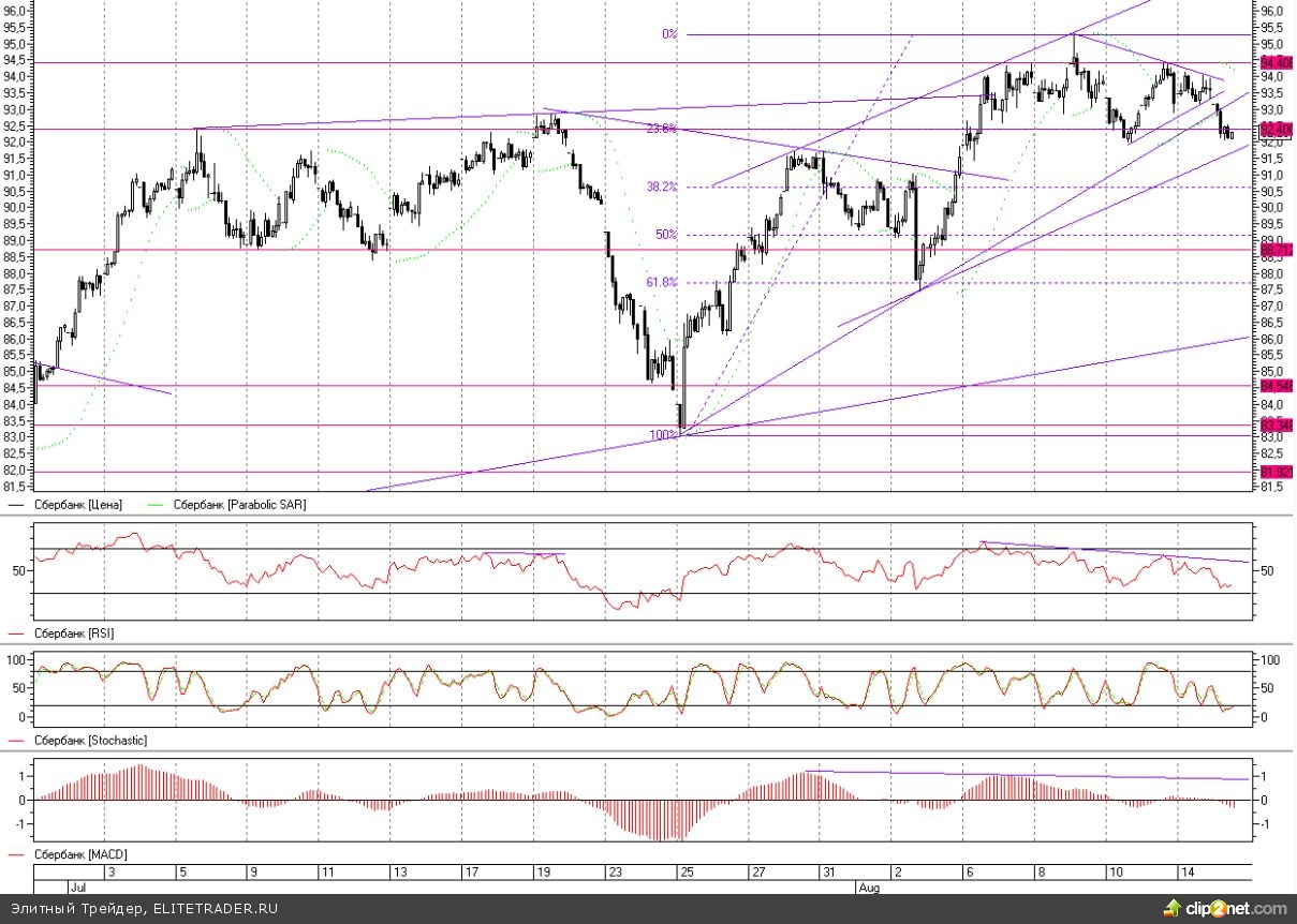 Цена на бумаги Сбербанка в первой половине текущей недели обрисовала границы локального сходящегося треугольника, из которого уже в среду она вышла вниз, пробив трендовую линию восходящего канала от июльских минимумов. Более того, котировки повторно опустились ниже поддержки на 92,4 и соответственно первого коррекционного уровня по Фибоначчи 23,6%, однако опять же продажи сдерживаются на уровне 92 руб. Соответственно обновление недельных минимумов будет сигналом к дальнейшему снижению с целью на второй коррекционный уровень 38,2% и далее к 200-дневной экспоненциальной скользящей средней в районе 89 руб. До этого момента можно рассчитывать на продолжение движения в боковике с целью возвращения к 94,4, но речь идет скорее об удержании длинных позиций либо о более комфортных уровнях для шорта нежели о новых покупках.