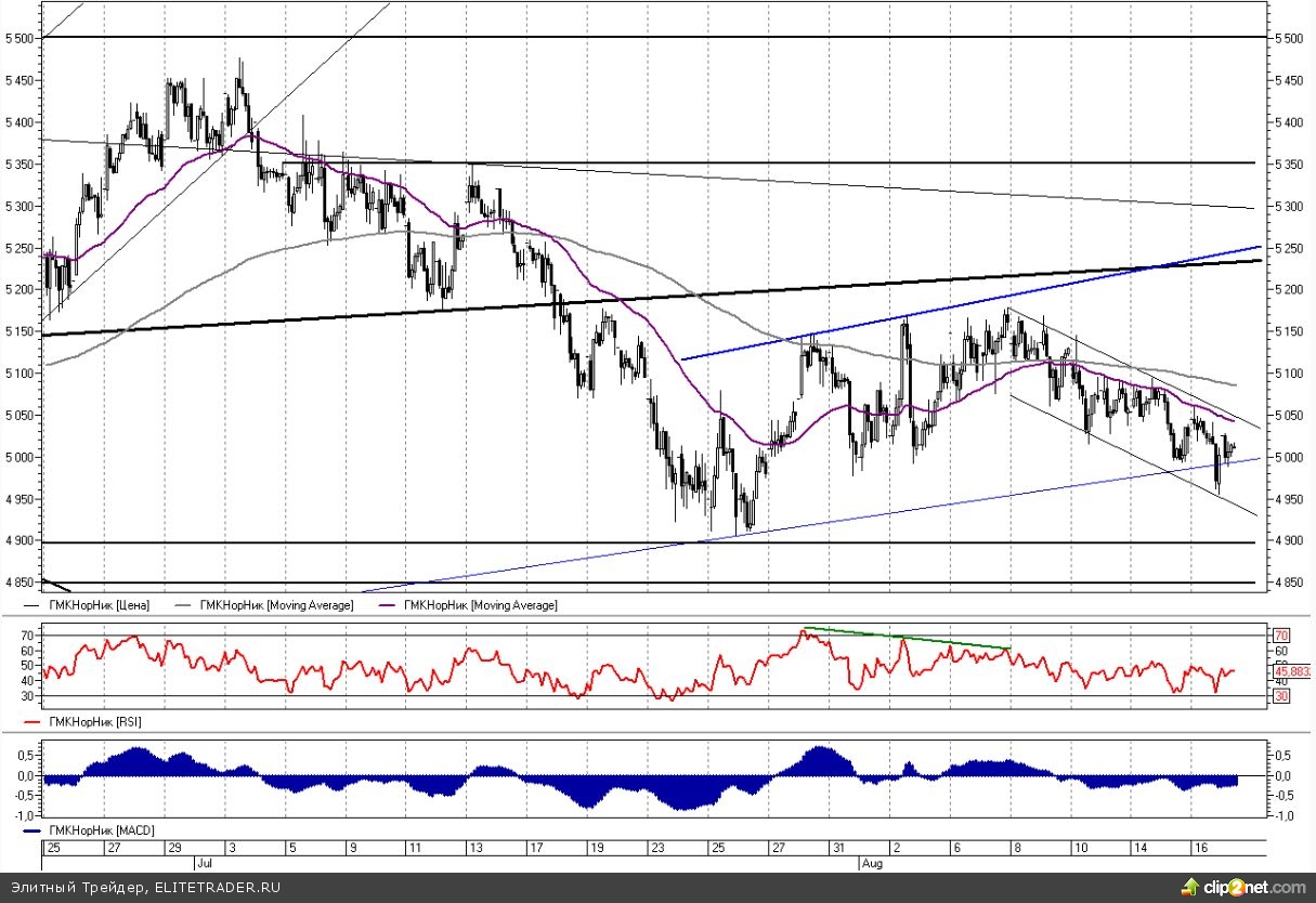 Таким образом, в данный момент бумаги Норильского Никеля продолжают оставаться на пограничной территории. Трендовые индикаторы на большинстве таймфреймов смотрят преимущественно вниз. До тех пор, пока цена окончательно не закрепится под нижней границей бокового коридора, то есть под уровнем 4990 руб., говорить о начале полноценного down-тренда преждевременно.