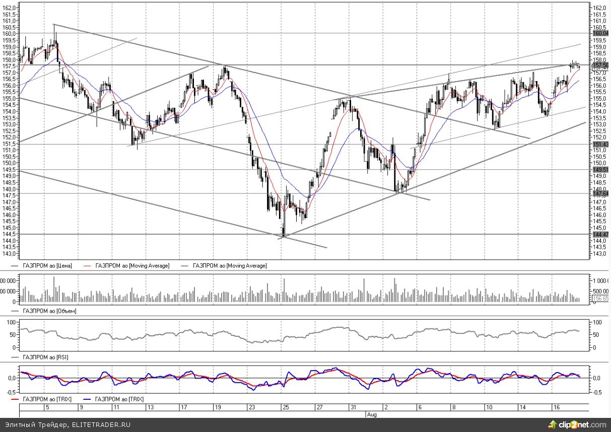 Но перегретость нефтяного рынка и вероятная там коррекция могут сыграть на руку игрокам на понижение. В этом случае на продажах по всему рынку Газпром для начала откатится в район локальной поддержки на 154, где попутно закроет два оставшихся на этой неделе гэпа, а потом на повестке дня встанет и восходящий тренд с конца июля на 153. Как раз от 157 будет хороший момент для открытия коротких позиций.