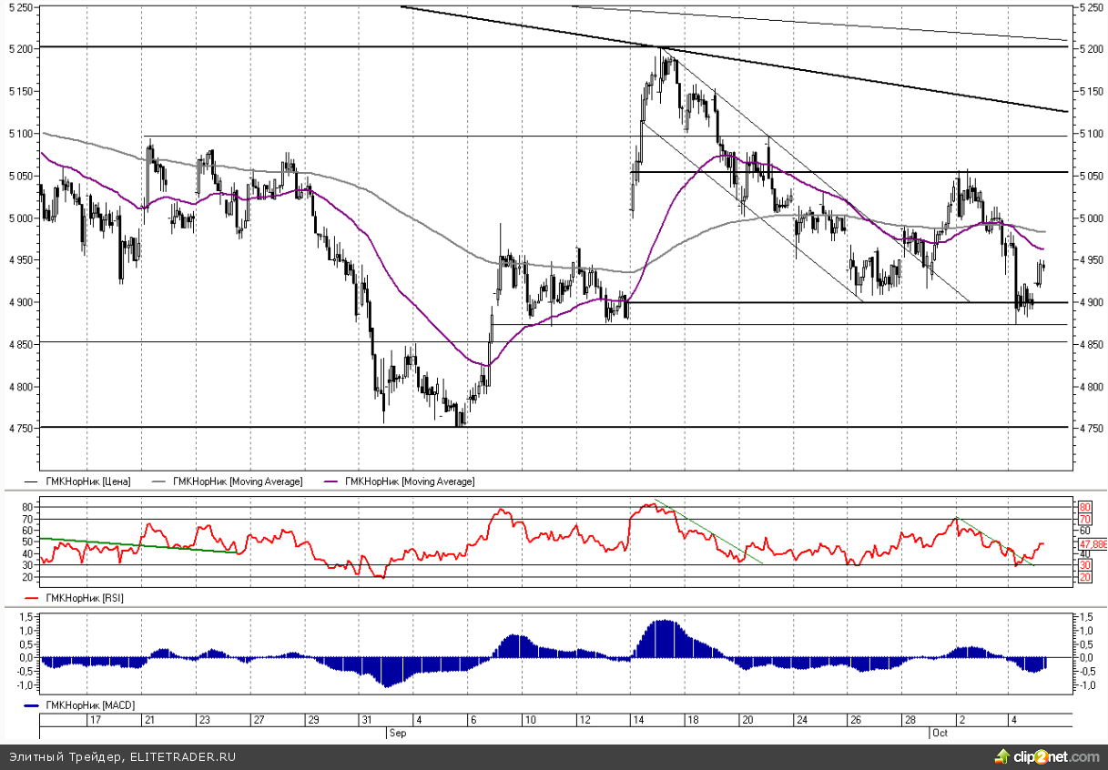 В данный момент бумаги Норникеля торгуются около уровня 4950 руб., прибавляя 1,05%. В прошлой рекомендации в среду мы советовали продолжать находиться в длинных позициях, удерживая стоп-заявки в районе открытия лонга (4900 руб). К сожалению, несмотря на всю достаточно оптимистичную технику и отсутствие очевидных препятствий для роста, в четверг на фоне падения всего российского рынка бумаги ГМК все-таки прошли на новые локальные минимумы, заставив нас выходить чуть ниже точки безубыточности.