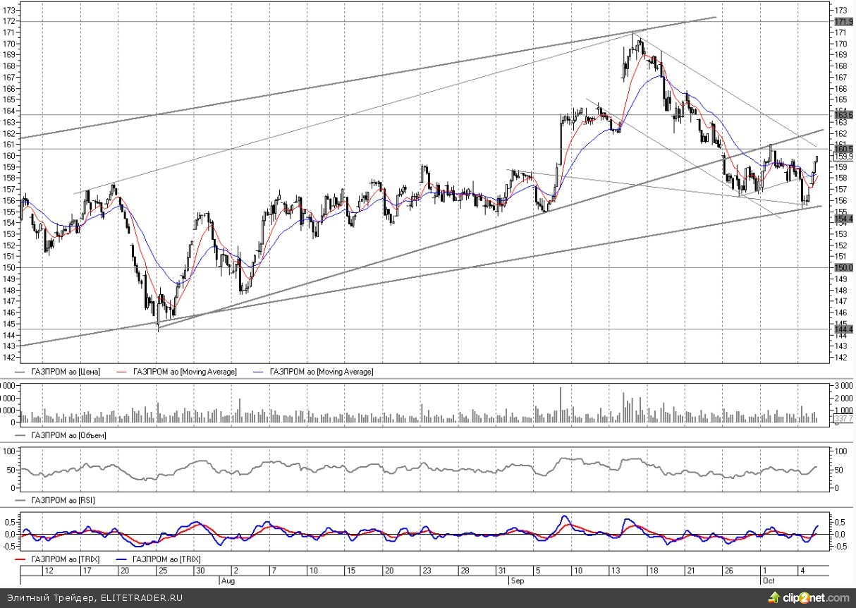 После реализации локального «флага» вниз Газпром откатился к поддержке в район 155-156. От нее сразу был организован отскок вверх с возвратом к пробитой накануне локальной линии, нижней границе «флага» на 158. Но и на этом покупатели не остановились, продолжая игру на повышение.