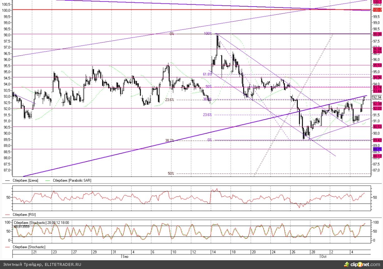 Котировки акций Сбербанка в уходящую неделю предприняли ряд попыток вернуться в покинутый в конце сентября восходящий четырехмесячный канал, но пока все они оставались безуспешными. Цена уже дважды откатывалась от пробитой трендовой линии, тестируя ее снизу, и к настоящему моменту имеет шанс в третий раз продемонстрировать подобную динамику. Не исключено, что откат состоится уже после того, как цена скользнет к 93,7, и закроет гэп от 26 сентября, в этом случае краткосрочно можно сыграть на стороне продавцов с целью движения к нижней границе краткосрочного восходящего канала на 91,5. Вместе с тем, цена подойдя к уровню 93,7 отыграет 50% коррекции к нисходящей волне от сентябрьских минимумов, что усиливает вероятность локального снижения. В то же время на дневном графике наблюдается пробой 50-дневной экспоненциальной скользящей средней, после того как ранее цена отскочила от 200-дневной, что дает повод говорить о покупке бумаг на среднесрочную перспективу.