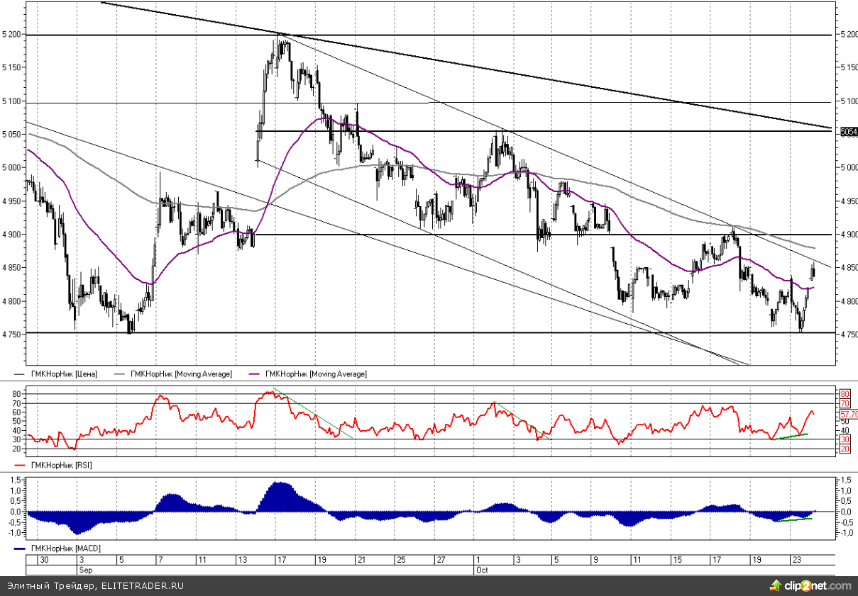 Что же касается пессимистичных сценариев, то среднесрочный план действий остается прежним. Рекомендуется открывать короткие позиции в случае спуска и закрепления цены акций Норникеля под отметку 4750 руб. При таком варианте целью нисходящего движения является обновление минимумов года с потенциалом упасть в район 4525 руб.