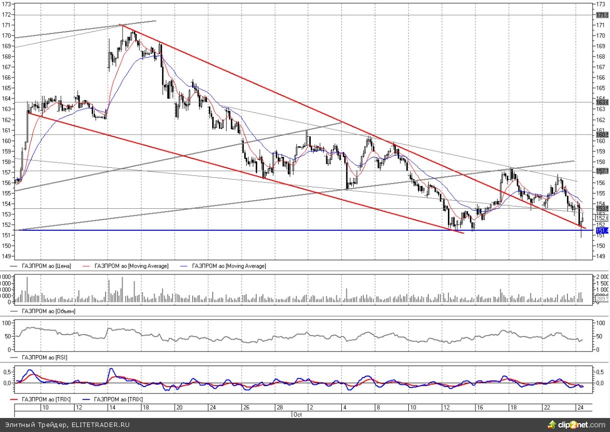 После небольшого отскока в начале недели падение возобновилось. Газпром на новых продажах откатился на новые минимумы. Сегодня цена в моменте откатывалась ниже 151. Последний раз бумага так дешево стоила два с половиной месяца назад в конце августа.