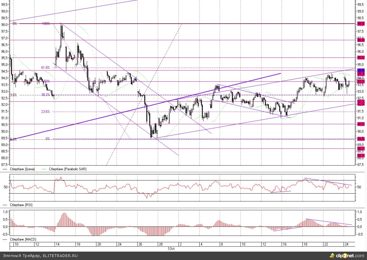 Так и не сподобились медведи вывести котировки акций Сбербанка к нижней границе месячного восходящего канала после того как цена откатилась от противоположного рубежа. При попытках снижения не раз быков выручали поддержки 92,6-92,8, от которых в частности прошел отскок сегодня, с формированием разворотной часовой свечи. Сохраняющаяся медвежья дивергенция по RSI и MACD остается последним оплотом обороны продавцов, который может быть нивелирован, в случае если сегодня удастся закрыть сессию в плюс. На дневном графике при этом сохраняются позитивные сигналы трендовых индикаторов, тогда как указывающие ранее направление вниз кривые стохастика пытаются развернуться на север. Таким образом, локально сохраняется преимущество продавцов, которое, тем не менее, ослабевает и уже к сегодняшнему закрытию может сойти на нет.